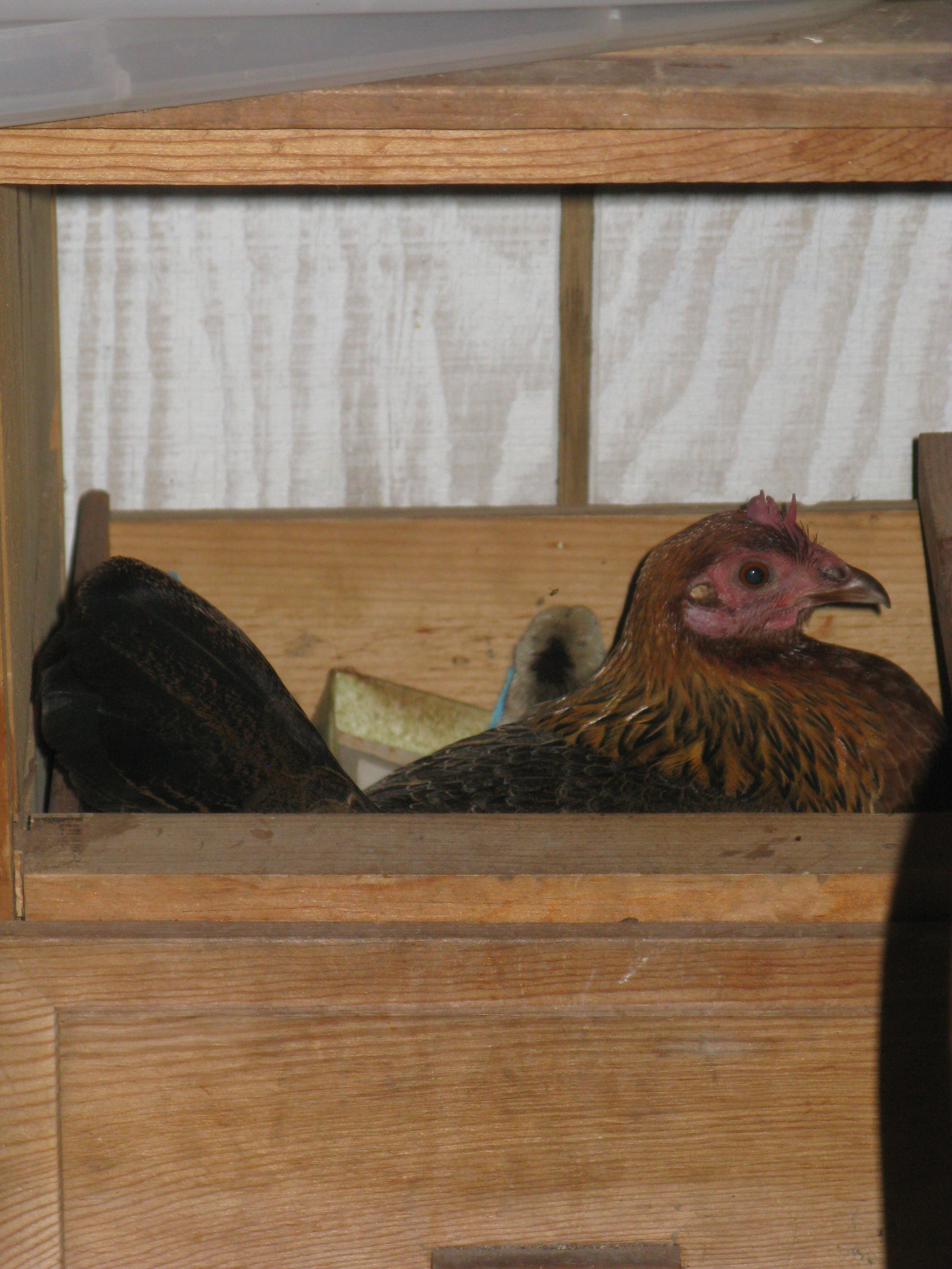 #1 ◱ Henrietta's chicks are hatching! At 8:45am we noticed two. One is in the desk (as is Henrietta) and one is out.