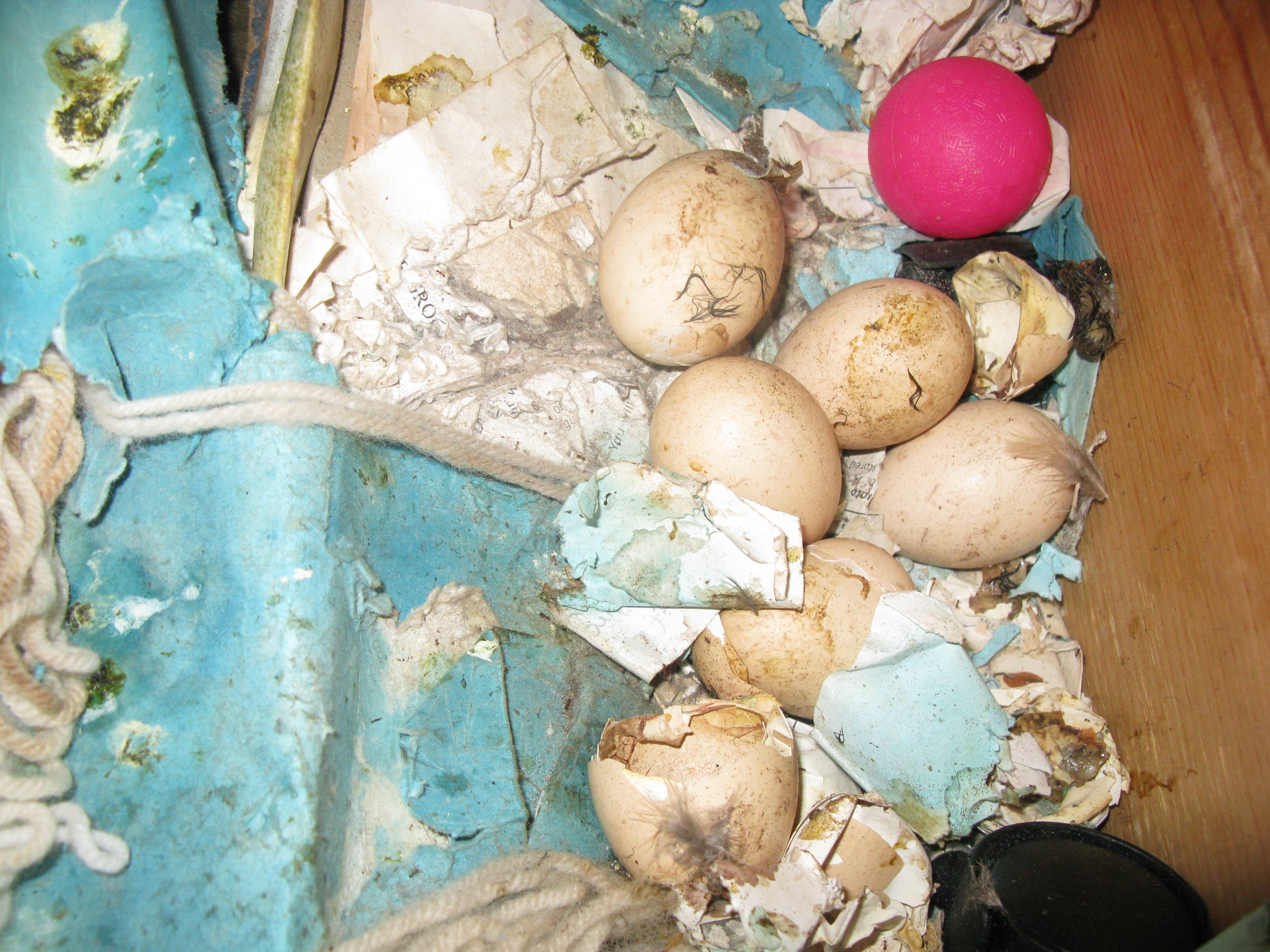 #8 ◱ 12:20pm - Saw Henrietta out in the yard, but didn't see four chicks, only three. So I took a picture in the drawer. The chick isn't in their either, and it looks pretty sick in there. I can't tell if those eggs are in the process of hatching, or chicks that didn't make it out or what.