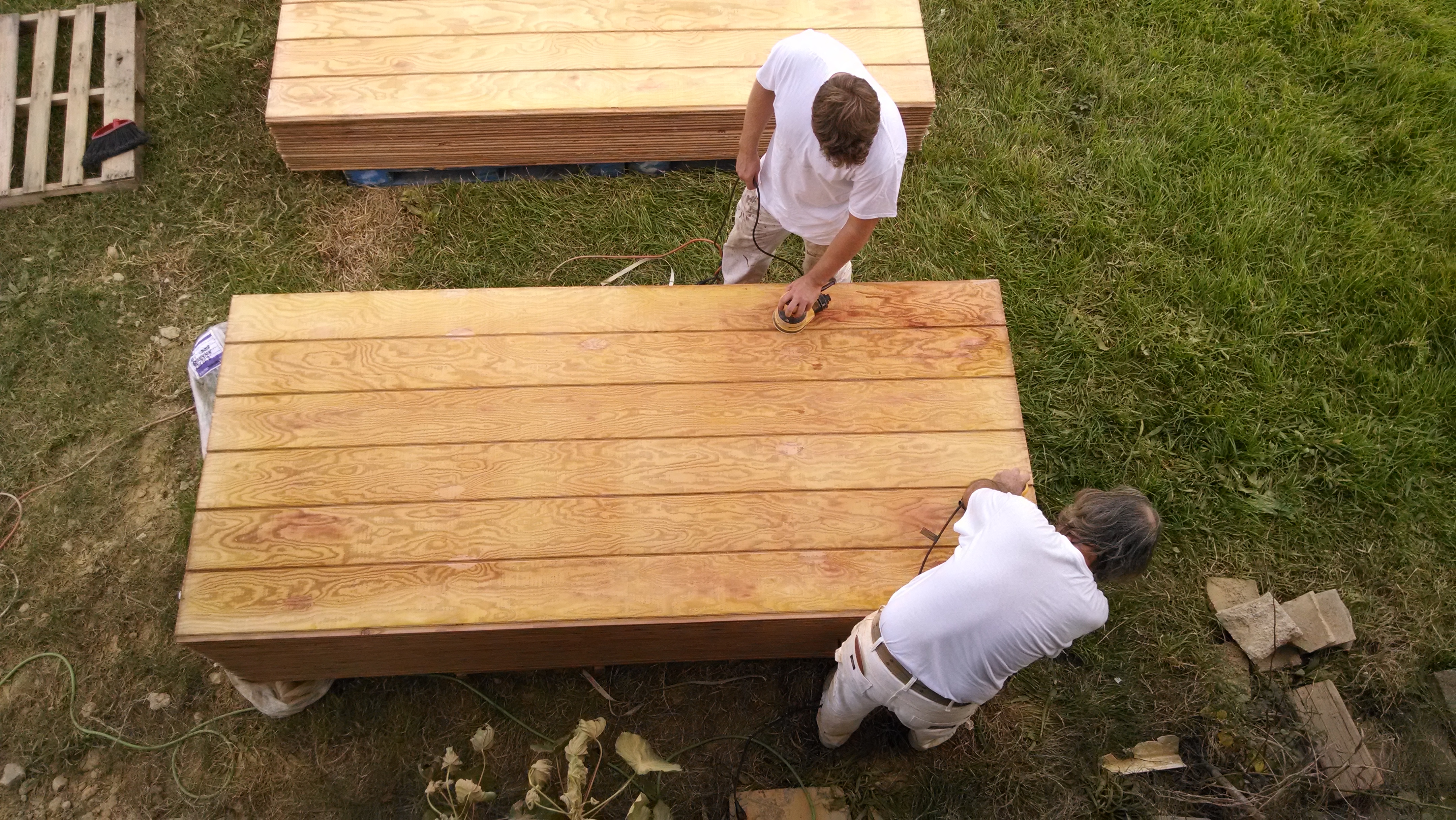 #2 ◱ Fred and Erich are sanding theT1-11 in preparation for primer paint.