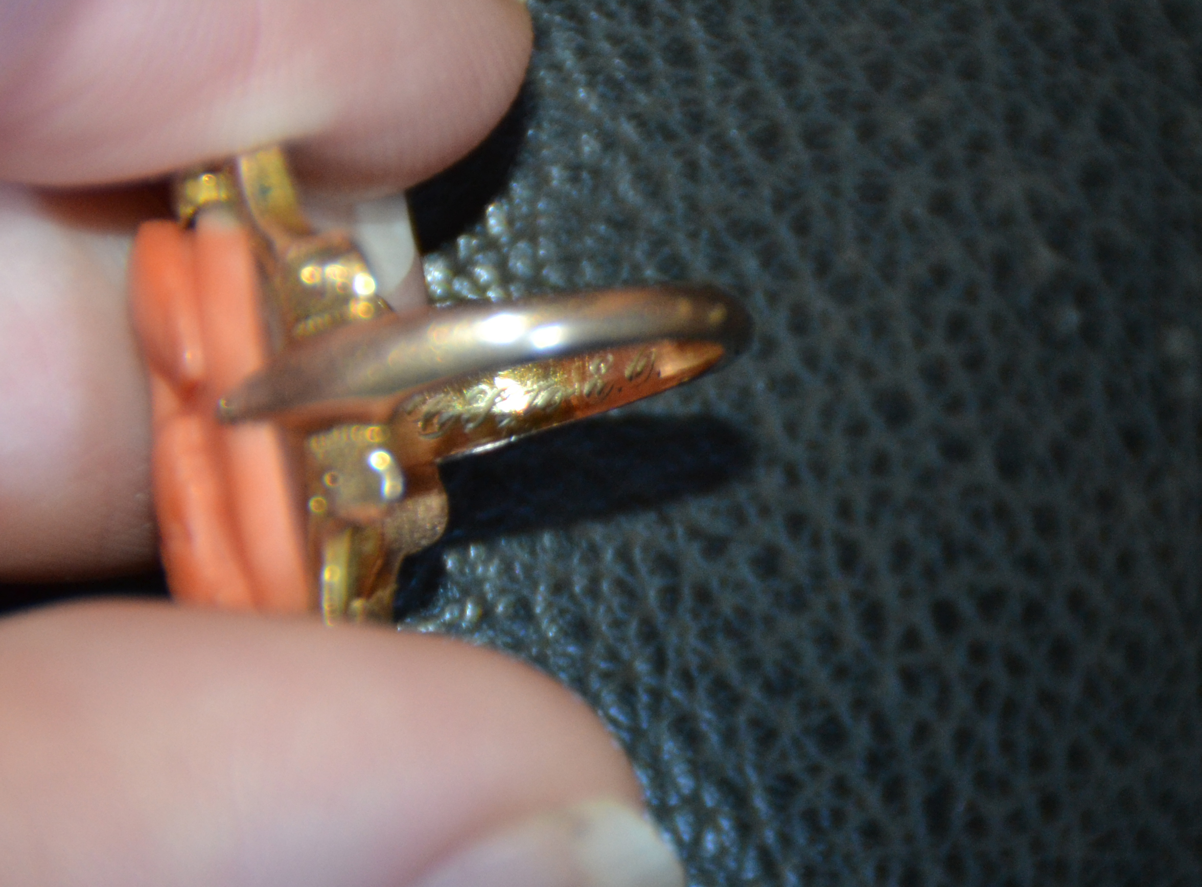 ◱ Conrad often gave Esther jewelry with her initials on it. After careful zooming and consideration, I think this ring is engraved with C S to E O.